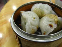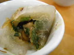 7/12(日) 1:30pm週日的七姊妹道,一片死寂,九成食肆關門大吉;還得把握於半句鐘滿足胃納.貿然踏入這環境不甚衛生雅潔的茶樓.點了一籠韭菜餃$8;一眾點心屬現成貨,目擊阿姐澆上一湯匙油;見狀也生怕!餃皮跟粉果皮沒兩樣;異常的厚;幸虧食味不致太可悲.韭菜豬肉餡不太細緻,並且由肥膏作主導.原想以蘿蔔糕填補胃納,最後果斷地以"新鳳凰"的招牌腿蛋包代之!查看更多