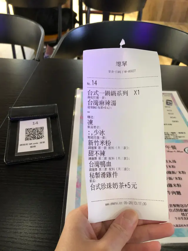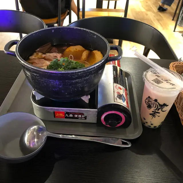 朋友介紹,呢到嘅台灣麻辣鍋味道不錯,中午搭正1點,就火速去到呢間餐廳。餐廳用了台灣圖畫及霓虹光管作裝飾,木製的枱櫈,空間寬躺不擠迫,環境亦乾淨。店員安排入座之後,會提供QR code,自行點餐。今次我點了「台式一鍋鍋」,係一個火鍋形式上枱嘅三餸麵餐,有好多台灣風味的餸可以選擇,解一解思鄉之愁。今次揀左:台灣麻辣湯+新竹米粉+台灣鴨血+滑雞件+甜不辣+台式珍珠奶茶,充滿台灣風味!湯鍋係用火爐上枱,仲要用多十幾分鐘去煮,所以 lunch hour 來食都真係幾趕時間**台灣麻辣湯:清爽的香辣口味,唔會辣到嗆口**台灣鴨血:軟滑Q彈**滑雞件:醃得好好味**甜不辣:有兩大塊!**湯鍋內仲有幾片羽衣甘藍,正加$5可以揀特飲,我揀咗珍珠奶茶,係外賣杯上的,由於時間緊迫,專心快速食咗個鍋先,飯品就拎返公司慢慢歎!…查看更多