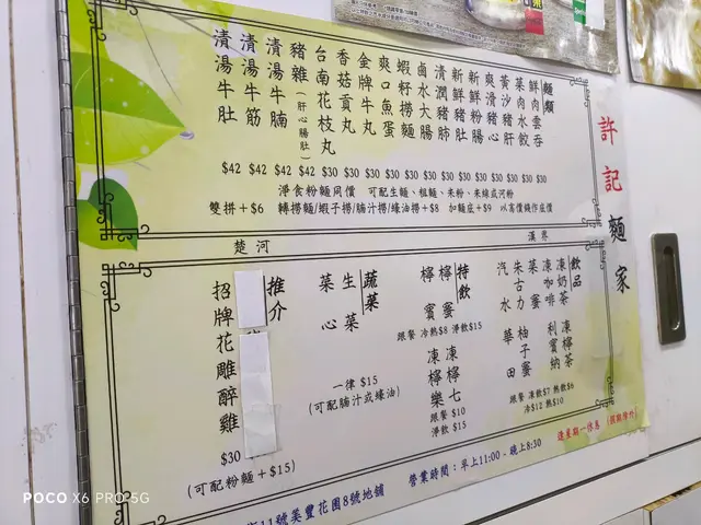上星期摸門釘,不甘心,今日再去呢間位於大埔舊墟既許記麵家,想一試佢地既招牌花雕醉雞。店舖小小,得十零個座位,坐低望下個餐牌,有牛腩有豬什食,但我想試既就係佢地個花雕醉雞,咁一於點個花雕醉雞湯粗啦!不一會就上餐,醉雞既份量係一隻雞髀,再加一碗粗麵,粗麵爽口彈牙,全無一點兒枧水味,加d紅醋落碗麵度一齊食,美味可口。花雕醉雞味道一流,有點幽幽既花雕味,恰到好處,冇苦味,一試令人回味無窮。[米饭]口味:🥚🥚🥚🥚🥚[薄荷]环境:🥚🥚🥚[服务铃]服务:🥚🥚🥚🥚[糖果]性价比:🥚🥚🥚