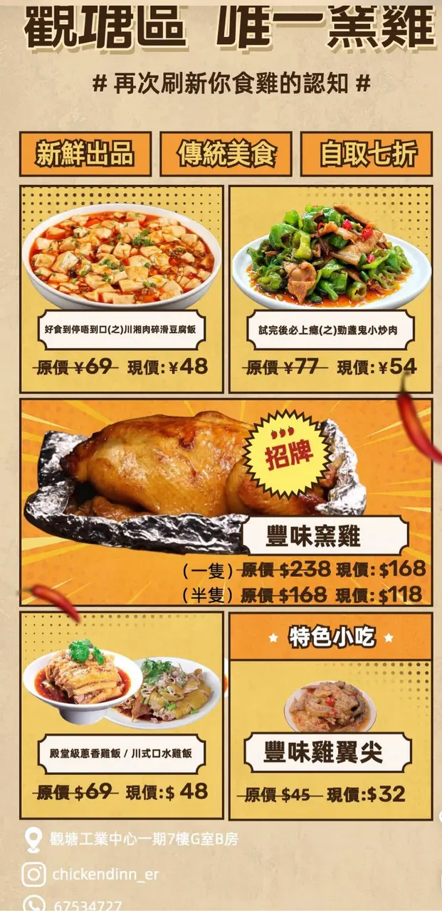 連續兩日打10號同8號風球,屋企基本上所有剩餘嘅糧食都已經食晒,今日收工之後就決定過觀塘呢邊加餸,之前已經食過呢間覺得勁好食,最鍾意嗌佢地嘅原隻豐味窯雞,而家佢哋仲做緊外賣自取優惠,只要買原隻窯雞,即可以一元優惠價加購每日精選甜品,都真係好抵,如果係喺呢度附近返工嘅人,就記住晏晝飯都可以過嚟呢度買,川式口水雞飯或殿堂級蔥香雞飯外賣自取優惠價只需要 $39,真係抵到爛!講返我隻窯雞,最鍾意呢度俾埋手套我,食嘅時候真係超方便,唔會落親手,另外加上呢度整嘅雞肉真係好嫩滑,好juicy,完全一啲都唔乾,屋企人個個食到都讚好不絕嘅!呢次都要左口水雞飯,食得超過癮!不過大家留意番,如果收工嘅時候先嚟,係會同人流相反方向咁樣行,大家趕住收工去地鐵站,你就由地鐵站行去觀塘工業中心,可能會嚇親一啲唔熟呢一頭環境嘅人,不過呢間真係值得你過嚟買!…查看更多