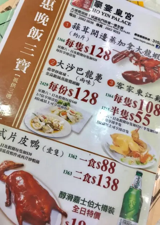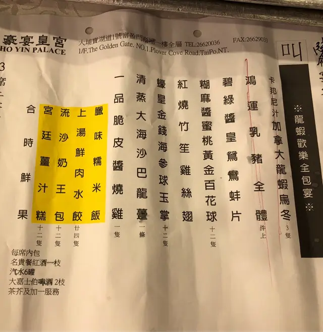 豪宴皇宮 (大埔) 網址: https://s.openrice.com/QrbS0PIW800 地址: 香港大埔寶湖道1號富盈門商場1樓 電話: +852 26620036