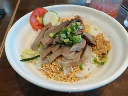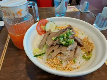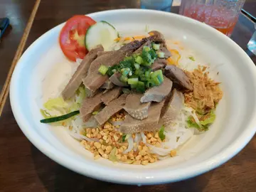 天氣熱,冇胃口,冷盤熱湯,粉麵飯也要細心選,期望微涼的日子。又路過此商場,見到越棧……想一想,就入去選擇一下。 平日常食的是,生熟牛肉粉,牛腩湯米,今日就食涼拌類,凍檬粉勁多選擇:1雞翼檬;2扎肉河;3牛肉;4雞絲河粉;5咖哩豬扒飯……又有小食:春卷,蝦餅,糯米雞翼,串燒,,樣樣都愛,可惜小肚小,吃不下。 今日點選了撈檬,因為凍食冇咁熱,餸就選了牛脷。不一會就送上一大碗,講真有驚喜,看見牛脷非薄片,件數也不少……Wow有誠意,我鍾意。一口咬下去,正,易咬開又煮得入味,今天果然是好日子。青瓜絲花生碎及雜菜,再加上每條檬粉吸收了香辣酸汁,每人食指大動。 最後由檸蜜成為是次酸甜美食之結,因為現在真原個切片檸檬也成為稀有時……查看更多
