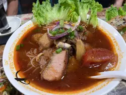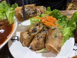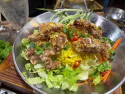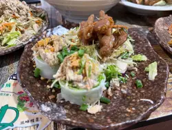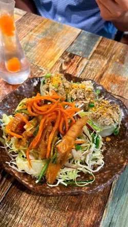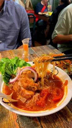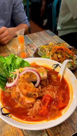 在油麻地行街搵到一間越南餐廳Meun幾多款式,餐廳都貼滿廚房參加公開比賽的錦旗和獎狀,看得出這間店對料理品質有極高要求,廚師是真材實料的實力派。👨🏻🍳🏆🇻🇳👫🍽️晚市的套餐可選一主食和兩份小食,小食就選了手撕雞柚子沙律配手撕雞檬紙卷。另一份是手撕雞柚子沙律配椒鹽脆蛋魚柳。份量很足,性價比超高,當作是開胃前菜真是適合不過。🐥🌮🥗✨ 招牌去骨海南雞配薑黃飯($92),海南雞超嫩滑,完全冇骨,皮彈肉滑,輕輕一撕就骨肉分離。油飯的椰香味道香濃,淡淡金黃色澤,每一口都充滿南洋風情,回味無窮。🐥🍚🥥✨ 牛豬蕃茄湯檬($109),湯底以紅蕃茄熬煮出濃郁酸甜味,先喝一口湯酸酸的很滋味。牛豬的組合包括了生牛肉、烤牛肉、豬頸肉與豬扒,肉類的部份很豐富,檬粉吸滿湯汁後極其入味,口感爽滑,整碗湯河都製作出色。🥩🍅🍜✨ 鮮菠蘿梳打冰(+$33),百分百新鮮菠蘿打製,自行加入梳打水,氣泡感十足,冰涼透心,解油解膩。🍍🍹✨ 龍眼花蜜茶(+$29),每天新鮮調製,選用天然龍眼花蜜,甜度適中、散發濃厚百花蜜香,溫潤不膩,🍯🍹…查看更多