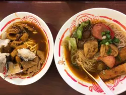 要急急七點前到達,遲到就人頭擁擁,食客一浪接浪殺到,無位坐啊!可口可樂,少可飲酒到天光要支回魂曲!黃昏四點的早午餐一剔過,加 $8 蚊有可樂,食四餸有免費可樂。整間舖瀰漫著抽糞車的異味,係咪暴屎坑呀?行出到門外就無味喎。係咪好唔想我黎幫襯啫?好采有睇單,漏走蔥漏雞翼。終於碗麵到喇,師傅再漏紫菜。轉晒師傅全部大媽?越來越難食,以前係幾個肥仔好食多倍。其實我係要鴛鴦,有剔幼麵及河粉的,不過四眼妹妹似乎先入為主,既然都已打錯,懶得再改啦。最後結果係食埋煎釀三寶都未夠飽,唯有飲多幾杯酒填充夠吧!兩溝鴛鴦都唔識煮?先烚麵後烚河乍喎。嚴禁戀溝,加錢都不可以,只準單點﹗無所謂,那我就叫一碗麵一碗河粉,火火地。寫到明走蔥,無得食鴛鴦再無走蔥,火上加火更加火﹗嚴禁兩溝?我要食鴛鴦無人阻到我,最多叫兩碗自己溝﹗竟然仲有隻烏蠅飛來飛去,極度討厭。座位迫迫夾夾,阿伯您大舊就唔好坐係我後面,其他位係唔坐,係要背對背頂住晒,比餐安樂茶飯我食得唔得呀!辣椒油,咸咸蝦米微辣微香而油感重,不喜歡這味道試一次便夠。泡椒雞腳,爽脆筋彈,咸鮮中辣刺激。咖哩陳皮魚蛋,陳皮味到位清香,其實配蠔油才是絕頂!咖哩厚厚黏黏甜味強而辣味微弱,肉質很削不彈假爽,散發少許腥味。鮑汁雞腳,為何比麵還要耐?又不用翻熱。原來有烚生菜墊底,原諒您啦。爽爽的雞皮及筋肉未見炆得黏膠,雞腳的豉油味強烈,鮑味呢?車王撈,咸王撈麵受不了,咸王雞中翼受不了!嫩滑雞皮結實白肉,滷得太咸浪費了!溏心滷蛋出色,晶瑩剔透,清香不濁,蛋黃甘甜黏黏。即食鮑魚厚厚彈彈,鮮鮑味突出。巨大蘿蔔兩舊腍腍爆水,高湯入味,表層有點縮有點塌。鮮冬菇滑嘟嘟少少彈,用蠔油炆過呢。魚肚吸汁多水索索湯更美味,花膠大大塊嫩嫩滑溜。竟是豉油皇炒麵底,有誠意估您唔到。嚥韌乾爽炒麵怪您過份重口味,硬著頭皮照食可也!醇厚濃郁豬骨清湯清甜可口,豉油皇炒麵食到尾聲已到達極限,沖沖湯洗洗咸,舒服許多。煎釀三寶,何解普通的煎釀三寶已等 10 分鐘有多還未到達?使得我心猿意馬忐忑不安,終於滾熱辣送到,感受得到的高溫,新鮮出爐剛剛炸起,真身為炸釀三寶!色澤光亮鮮明,索一索肉香撲鼻,明顯地不是翻炸乾屍的呢!續一擊破,先由紅腸開始。肥美厚切大紅腸,清甜的肉味絕不咸澀,尖椒炸得透徹全熟,清甜味出眾,爽脆多汁美味無得彈!豆腐皮脆肉嫩,白肉滑溜不得了!厚厚的鯪魚滑,搽得均勻非常,封得密實沒有虛位,不是馬虎的薄薄的一篤仔,炸得香口彈彈,乾爽不油膩,滿有鮮魚味道可口不腥嗅,淋上芬芳甜豉油,充滿生命力!古祖味牛腩麻辣牛肚麻辣牛柏葉特濃牛骨湯麻辣汁幼麵,古祖味牛腩即是懷舊車仔麵味道?果然一模一樣同出一徹,幸好不是太腩碎腩邊!鬆化完整的一舊舊牛腩粒,五香味濃合格。麻辣牛肚金錢肚爽爽彈彈,微弱的辣味不太感覺到,五香反而更突出。麻辣牛柏葉,烚得剛好不超時,爽彈無比散發少許雪味呢。微辣的麻辣汁還沒有跟麵跟湯撈勻便大大啖一次過塞入口!微辣微麻迅間消散,添味真的不錯。濃郁香醇牛骨湯,有著潮州麵檔的影子,淺色極幼麵詐看還以為是米粉,我喜歡食硬麵要有嚼勁的。極腍的質地,十分濕滑,不彈帶少少爽。即時聯想到紅磡張榮記蝦子麵,跟他們的高檔優質蝦子麵非常相似呢。鮑汁魚肚惹味豬紅客家黃炆腩肉沙嗲醬特濃豬骨湯粗麵,豬骨湯係有料到既。索價 $10 蚊條魚肚,長方條形索盡鮑汁,爽爽綿綿趙得舒服。惹味豬紅一片片,先嚥韌一咬爆開,沒有特別的感覺。客家黃炆腩肉,硬硬地鞋鞋地咸咸地。廉價車仔麵檔的無味紙條全蛋麵,沒有彈感,鞋鞋不香,幸好沙嗲醬香甜拖著豬骨濃湯齊齊吸啜,才不至評於劣質。豬骨湯黏稠味濃十分出色,撈埋沙嗲醬點綴一下生色不少。紫菜柱侯牛筋墨魚丸牛腩汁特濃牛骨湯河粉,阿妹我要走蔥架,激死我。費事騰來騰去浪費時間,自己挑走好過!河粉堅得好好味,綿綿滑溜溜,拖著濃郁醇香的腩汁牛骨湯啜啜啜,滿足滾動!夾著咸香爽脆紫菜齊齊啜更是一絕。墨魚丸粉口黏黏的廉價墨丸,柱侯牛筋碎濕濕軟滑有點過咸。厚切紅腸潮式滷豆腐腐皮炸蝦卷特濃豬骨湯河粉,次次湯底濃厚香甜,但依位四眼嬸煮出黎淡如水!即落五羹辣椒油都係無味,辣椒油唔掂,湯底又唔掂。紅腸及滷豆腐都有煎過夠誠意,紅腸超高質肥美嫩彈清甜還有焦香味道,使得我愛不釋手食唔停口!潮式滷豆腐平凡水準食完都唔記得,外皮嚥韌裡面藏著豉油水般。腐皮炸蝦卷味道似魚餅多過蝦卷,結實咸咸地無特別。望穿秋水我碗幼麵遲遲未送到,所有餸菜都經已食完段時間先捨得登陸。黃金炸魚皮滷水溏心鴨蛋咖哩魷魚特濃豬骨湯幼麵,湯底一樣淡如水!黃金炸魚皮極香脆,原來係咸蛋黃略咸,浸浸湯洗洗去舒服多了。滷水溏心鴨蛋,甘甜蛋黃好味道。咖哩魷魚勁彈震騰騰,卜卜脆味道香濃咖哩味。機會黎喇飛雲﹗合體完成。湯底實在淡茂茂水汪汪,麵淡粉淡!辣椒油有蝦米咸咸竟然不辣,非常失望!完全提不起興趣,食慾消減得非常迅速,但不可以浪費食物的,馬虎求其全部吞落肚,食完即閃沒有任何留戀。紅燒豬軟骨南乳豬手滷水豬大腸咖哩醬特濃牛骨湯出前一丁,我寫明多汁都只得一篤仔,既然漏走蔥及漏雞翼,連多汁都漏埋都可以理解。紅燒豬軟骨大大舊啖啖肉,紅燒汁甜甜醃味濃厚膩滯,鬆化的瘦肉包著軟骨脆卜卜。南乳豬