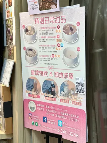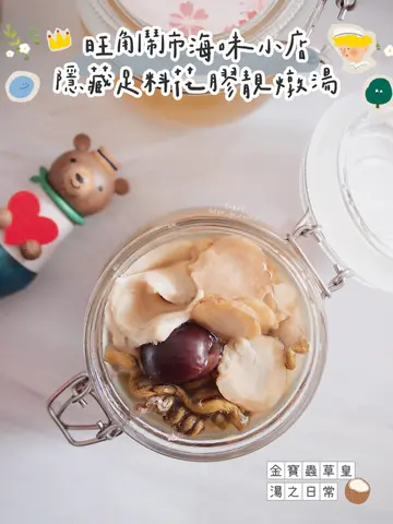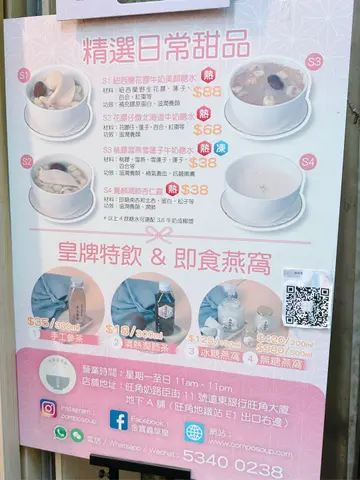 最近公事私事兩邊忙,每天都是早出晚歸多,有時候連媽媽煲的湯水也喝不到兩三碗,幸好有天在公司附近地區發現一間售賣手工製作湯品跟糖水,隨時隨地都可以飲用滋潤一下清熱補氣花旗參烏雞湯 $ 68用上美國威斯康州花旗參、野生石斛、螺片、圓肉、竹絲雞等熬製而成,用料豐富,每款食材都是具有滋陰補腎、補益心脾、養血安神的功效,亦有助增強身體免疫能力,降虛火抗疲勞~ 入口清甜有回甘,啖啖花旗蔘香氣,雖則以竹絲雞入饌不過雞油不會多喝下來不會覺得油膩!非常適合經常熬夜的朋友(就如我)來滋補潤澤一下~ 加上竹絲雞是比一般的雞隻更滋補更溫和,就算不是熬夜的也可以多喝啊!桃膠雪燕雪蓮子牛奶糖水 $38若覺得單喝湯水不足夠,可以像我一樣再來一份糖水!這個桃膠雪燕雪蓮子牛奶糖水,聽名字也知道這個糖水用料十足又滋潤~ 絕對是補身之選!打開碗蓋真的嚇一跳!桃膠跟雪燕的份量多得很,桃膠大塊又彈牙,雪蓮子口感煙韌,雪燕更是每一口都嚐到絲絲美味,還有其他食材如蓮子和百合!加上店家利用燉製方法製成,加熱後食用口腔會彌漫著奶香跟及蓮子香,不會太甜太膩還要入口順滑好吃~ 所用食材全都具有滋潤養顏、補氣養血、抗皺嫩膚的功效,多吃幾碗說不定變得更青春可人!想來一份效敬媽媽就最好不過了~靈芝石斛龜苓膏 $88最近沒有充足睡眠時間,牙肉腫痛上火燥熱的情況一直困擾著我,平常都愛吃龜靈膏降火降燥~ 買來一份靈芝石斛龜苓膏,用上龜板、野生靈芝、野生石斛及遠年陳皮等名貴材料製成,真材實料,口感順滑,甘苦且帶濃郁藥材味,味道很可以!如果不喜歡這種甘苦感,可以向店家索取糖漿一同食用啊!對長期熬夜、工作壓力大的朋友,有助身體恢復元氣,調理身體~店家位於旺角核心地段,在大型商場跟地鐵站出口中間,外帶燉湯甜品回家也很便利!這店主打每日手工製作湯品,100%原材料燉煮,堅持以「無防腐劑、無添加劑、無味精」的原則用心製作,不論營養或味道都有一種住家的感覺~ 無論是湯品或糖水均設有冷熱兩款,方便即時飲用或帶回家加熱再與家人分享!價錢方面在我而言的確是有點佛心,定價親民用料十足,而且免卻備料跟製作時間,很推薦給一眾無飯夫妻啊~