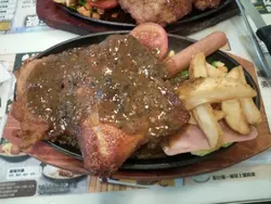 今日去開淘大睇戲,睇完戲見間間餐廳都咁多人,就諗住慢慢行返地鐵站睇下有咩食,點知途中就見到金拇指米線,就決定入去食返碗米線啦。坐低見到餐牌,咦,68蚊有鐵板食咁抵?即時決定改變主意唔食米線,轉食鐵板雜扒餐。先來餐湯同餐包,餐包微暖,應該有用微波爐輕微叮過,餐湯味道有d過酸,但勉強可接入口。等左15分鐘,主角既雜扒出場喇!一上檯嘩左一聲,因為真係好大份,雜扒有豬扒,雞扒,腸仔,火腿,再配埋薯條同蕃茄,份量十足。豬扒同雞扒都唔會煎得太韌,用刀一砌就開,配埋黑椒汁食真係一流,食晒成個雜扒真係有少少飽到行唔郁。鐵板餐仲配埋餐飲,味道當然無得同專業扒房比,但以68蚊有咁既份量同質素,絕對超值。查看更多