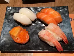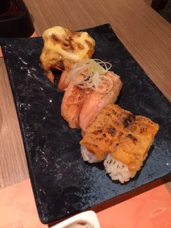其實呢兩串都唔差,不過煙肉味太濃,食唔出帶子同三文魚。火炙壽司