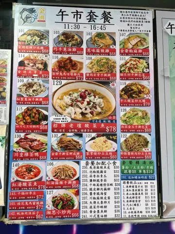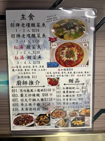 香港自家制老壇酸菜魚(中央自設工場,可自己選擇酸辣度,迎合個人口味) / 金玥招牌口水雞,自家制硏發口水雞醬料,醬料包含(麻,辣,鮮,香)味道,所有雞每日新鮮處理及己去骨 / 巧手蔥油雞,充滿乾蔥,蔥油及蔥花,蔥香撲鼻而來,值得一試 / 麻婆豆腐, 四川傳統名菜之一,口感味道層次豐富,包含麻,辣,鮮,香,嫩,滑,燙,送飯一流首選 / 帝王辣子雞,把雞肉砍成小塊,放入醬料醃製入味後,再進行烹煮,這樣炒出來的辣子雞才會更加入味。