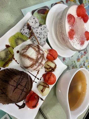 本身路過諗住睇吓佢係咩類型嘅甜品店 點知發現佢唔係淨係賣水果甜品 連傳統糖水同小食都有賣食開金滿堂小方糖個啲我真係食厭哂天氣咁啱轉涼就嗌左個熱嘅香芋紫米露 尤其是紫米露係女仔恩物 咁嘅時候食真係啱啱好 個人瞬間温暖哂一打開已經好重椰香芋頭香 芋頭足料之餘口感都係綿密嘅 煮得綿爛嘅紫米露配埋椰奶更加香滑濃郁佢唔係死甜先係最重要!當然我仲有嗌其他嘢食 不過都係一般水平 無辦法嘅係個香芋紫米露太岀色 已經蓋過咗本來對其他嘢食嘅期待值有機會先再試吓其他佢推薦嘅甜品啦 回購香芋紫米露就一定㗎啦環境我覺得都算整齊 仲有養住兩條招財大魚 依個都幾得意幾吸引查看更多