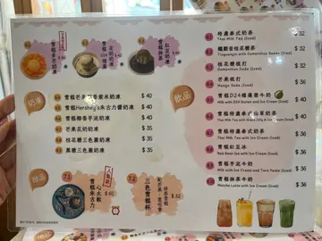 招牌綜合三色圓、桂花酒釀三色圓、泰式奶茶剉冰、抹茶/黑糖蕨餅、抹茶紅豆奶凍、桂花糖三色圓豆花