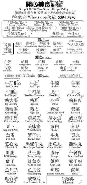 Happy Valley doesn't have any cart noodle shop. But then Happy V Food opened and business was buzzing. A small take away shop that took over the Pestle & Mortar location. They do have a few seats but it's mostly for take away. And that is fine for the residents that live here. So, on a cold evening, boyfriend and I decided to try out their cart noodle.The place is small and it appears they didn't renovate at all from the previous owner. Menu is in English and Chinese. There is no 10% service charge. You order by checking off a paper menu. They also stress they do not use any MSG.They had a menu that featured lo shui or Chinese marinaded items. They even had an article explaining what was lo shui. I guess that was the thing to get!Three toppings cost $49. You get a choice of noodle and additional sauce for the soup base.Boyfriend added satay sauce. For his three items he chose beef tripe, brisket and kaniko ball with a yellow noodle. There was also some lettuce added. The noodle was just cooked so it was still chewy. The sauce didn't have much satay flavor. The kaniko balls were great with a bit of savory roe inside. The brisket and tripe were soft and tender.I added the lo shui sauce. My three items were all lo shui items: tofu, chicken wings and tendon with a rice vermicelli. Lettuce was also provided. The sauce was not too salty which I guess is a good thing. The tofu was firm and not too salty. The tendon was soft. The chicken wing wasn't marinaded enough. For lo shui items, I've had much better elsewhere as it wasn't as deep and rich in flavor.Overall, prices are reasonable for what you get. Food tasted ok. But then there are no other choices around here for cart noodle. I guess I'd be back as I live close by so if I want take away, it's an option.…查看更多