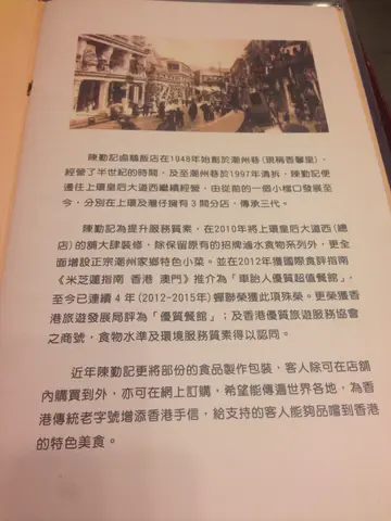 近兩年,皆有持續購買團購卷光顧灣仔的陳勤記,並非因為她的水準超然,其實向來不過不失,但$99買到$200的現金卷,雖然加一前菜另計,並非真正半價,用得著,當作七折多計,尚且化算,尤其是地點適合,家常小酌之選。 陳勤記歷史悠久,知名老店,懷舊裝潢,簡約設計。多次惠顧,心中有數,點選差不多固定。胡椒豬肚湯(3/5)喜歡它胡椒辛辣味足,湯清無味精亦不過鹹,芥菜及豬肚依然有嚼勁可吃。魚飯(黃花)$198 (3/5)一般有3款,馬友、黃花及烏頭,皆已嚐過,前者肉質最質在,其餘兩款較腍軟,味道相差不遠,最主要碰碰氣,魚是否肥美。烹調少有失準,並非難製,只要新鮮便成,因此魚飯每天供應數量有限,務必天天清貨。據說潮州從前並非富裕之地,海產卻又豐富,平價魚捕獲後,以鹽醃保鮮,蒸熟後備吃,涼食凍魚,因為粒粒肉質似米飯,所以稱為魚飯,也許有些日子,米飯相比凍魚要貴。簡單烹調,就是吃其鮮味及肉質之嫩滑,黃花非新鮮,但吃之無雪味,鹽醃之妙效!魚肉只有少許鹹香,因此醮以鹹香更足之麵鼓醬更見功效,提鮮添味;一般揭開魚皮只吃肉,魚皮非常靱皮,又真是吃不下。炸雙棗 (蝦棗蟹棗) 1/5