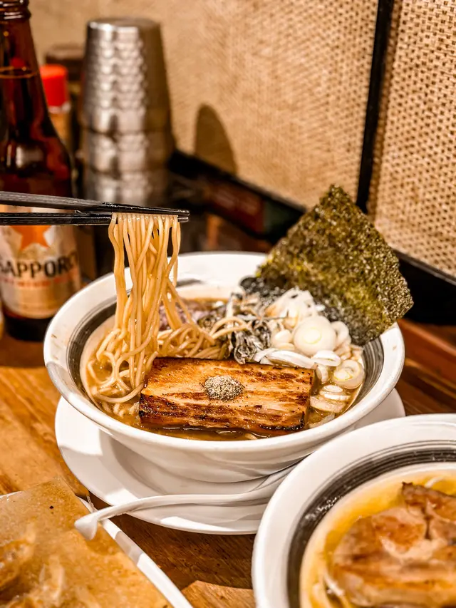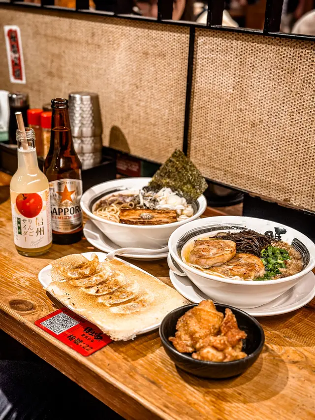 今次嚟到中環蘭桂坊附近嘅霸嗎拉麵,夜晚時段滿座非常熱鬧。店舖似日本地道拉麵小店嘅格局,幾有氣氛。一坐低就已經聞到陣陣濃郁湯底香,即刻醒神晒!煮干魚介豚肉拉麵見係新出品就嗌嚟試吓。個湯底真係不得了!煮干(即係小魚乾)熬出嚟嘅湯,飲落超濃厚,魚介香氣好突出,鹹度同濃度都十足。豚肉叉燒厚薄適中,肥瘦相間勁入味。麵質係直身幼麵,煮得啱啱好,爽口彈牙,掛湯力一流。雞叉燒雞白湯拉麵如果想清淡少少,呢款就好啱。雞白湯飲落順滑,奶白色嘅湯頭充滿雞肉鮮甜味,唔會太油膩。雞叉燒係亮點!切成薄片,肉質非常嫩滑,帶微微炙燒香氣,正!唐揚炸雞炸得好靚,外皮金黃脆口,咬落去肉汁好豐富,唔會乾爭爭。羽根燒餃子煎得香脆,底部形成一片薄薄嘅「羽根」(冰花脆皮),餃子皮薄餡多,肉餡juicy,點醋食好惹味。叫咗杯麒麟一番榨啤酒,冰涼爽快,同濃味拉麵超夾!朋友就叫咗信州蘋果梳打,清清甜甜,可以平衡返拉麵嘅濃厚感。如果你鍾意濃厚系拉麵,煮干湯底真係要試,湯頭夠霸氣;鍾意清新嘅就可以揀雞白湯。鋪頭位置方便,喺蘭桂坊食碗暖胃拉麵,再歎杯啤酒,滿足!…查看更多