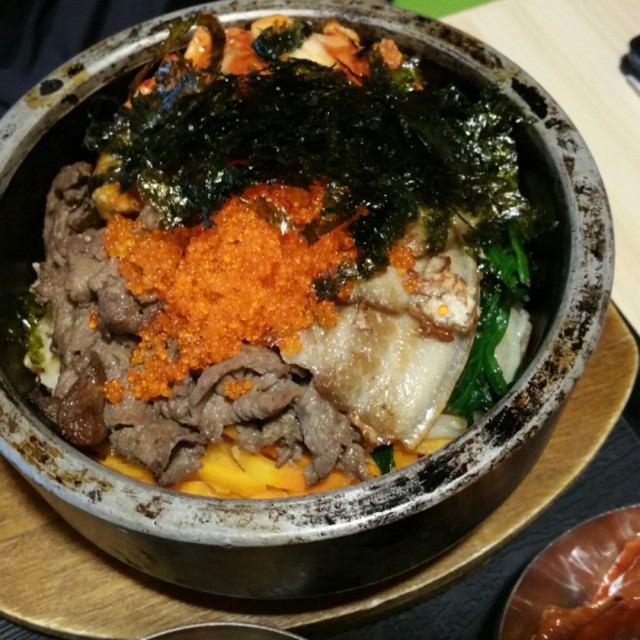 咁今日就同一班fd去左尖沙咀去搵野食喇本身諗住去h8到食西班牙菜點知要等位咁我地就去左下一層嘅韓國野到試下一入到去環境幾好幾光猛又冇咩人唔洗等位咁我地本身諗住之後再去食甜品所以就冇叫烤肉個啲野食所以每人只係叫左一個飯OR面食姐咁叫完野食之後佢地就上左啲小菜有泡菜同樣樣我唔係太清楚嘅小食咁我自己唔係太食得辣就覺得辣左少少而我自己就叫左牛肉石頭鍋飯黎到個陣已經覺得個鍋唔係好夠熱食落就完全冇咩味撈飯個辣醬剩係得個辣字又冇咩其他味跟住我地都有叫個泡菜餅share黎食個餅就一般般煎耐啲會好啲我覺得呢間鋪頭又唔係平又唔係太好食我諗試埋今次夠喇