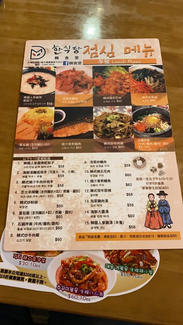 韓食堂·明洞 (大埔) 網址: https://s.openrice.com/QrbS0aAa800 地址: 香港大埔安泰路1號大埔廣場地下G60號舖 電話: +852 23990929