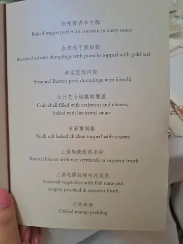 Had the chance to try their lunch becoz of some special occasion. .The set came with Baked Wagyu Puff with Coconut in Curry Sauce, Steamed Lobster Dumplings with Pomelo Topped with Gold Leaf and Steamed Iberico Pork Dumplings with Kimchi first. The Baked Wagyu Puff smelled luring becoz of the curry, the Steamed Lobster Dumplings looked cute with its pink exterior and the kimchi of the Pork Dumplings enhanced its savoury. Crab Shell filled with Crabmeat with and Cheese baked with Bechamel Sauce was then served. The crabmeat was not as meaty and cheesy as I expected, and it was a bit hard to get the meat out. Next, we got Rock Salt Baked Chicken Topped with Sesame. The skin was crispy and the chicken meat was tender. Later, Braised Lobster with Rice Vermicelli in Superior Broth was served. Again, it was quite difficult to enjoy the meat, and the rice vermicelli was a bit piecemeal. After that, we had Seasonal Vegetables with Fish Maw and Conpoy poached in Superior Broth. Not a very memorable dish. Personally liked the dessert the most, which was Chilled Mango Pudding! The condensed milk on top was subtly sweet and milky, which complemented the pudding well. It was very refreshing to enjoy during the summer time! .The resto looked decent and exquisite. It was spacious which could fit numerous guests. We, however, waited for the food for quite a while... If would be nicer if the food could be served faster...…查看更多