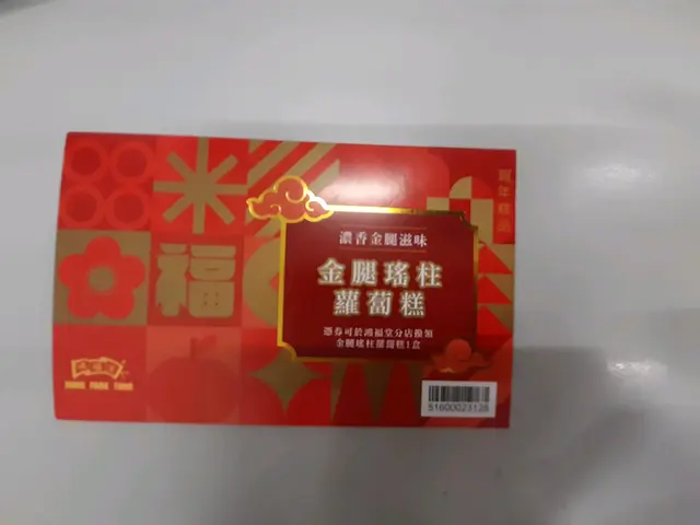 21-1-2025 (Tue)運輸公司送年糕劵俾我哋,今次係鴻福堂,睇睇張劵,係金腿瑤柱蘿蔔糕,俾劵當日,係可以喺全線鴻福堂攞嘅最後一日,之後日子就要去指定鴻福堂攞,印象中,我冇食過鴻福嘅,我就喺-1-2025(Sat)同老公食完晏嚟攞,店員都提醒返到屋企要雪,重順便講句祝福語。到29-1-2025(Wed)大年初一朝,就同老公切年糕先蒸嚟食,喺切嘅時候都有啲難,因為較實淨,見到係有瑤柱絲,蒸完軟腍腍,調味適中,口感都正常冇問題。之後兩朝都有煎嚟食,當然自己煎到外脆內熱食冇影響味道。…查看更多