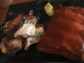 招牌拼盤有半份烤雞半份燒烤豬肋骨,西式涼拌菜同帕馬森薯條,烤雞有少少蜜糖甜味,肉質較乾,豬肋骨醬酸酸甜甜好惹味,肉質挺嫩不韌,2兜西式涼拌菜好好味,好爽口,不會太酸,減低那麼多肉的油膩感,薯條厚切外少少脆裏面粉糯,我喜歡這個質感…查看更多