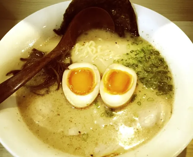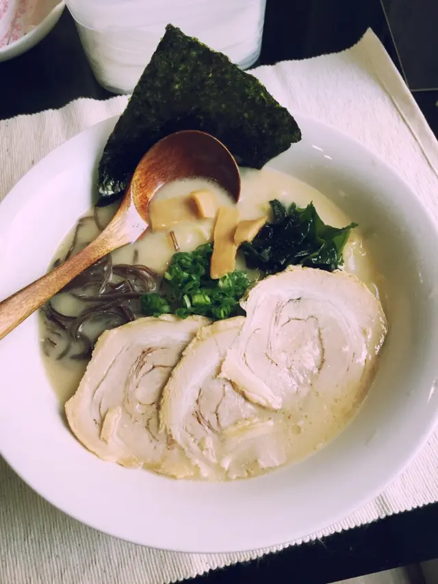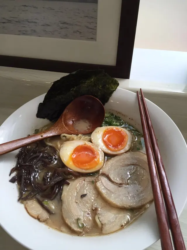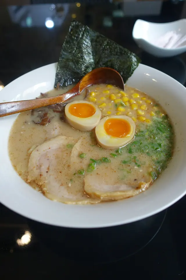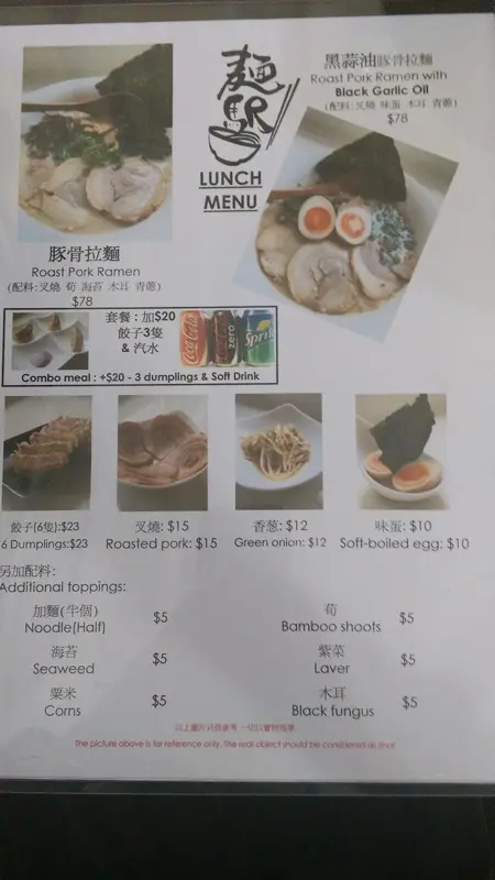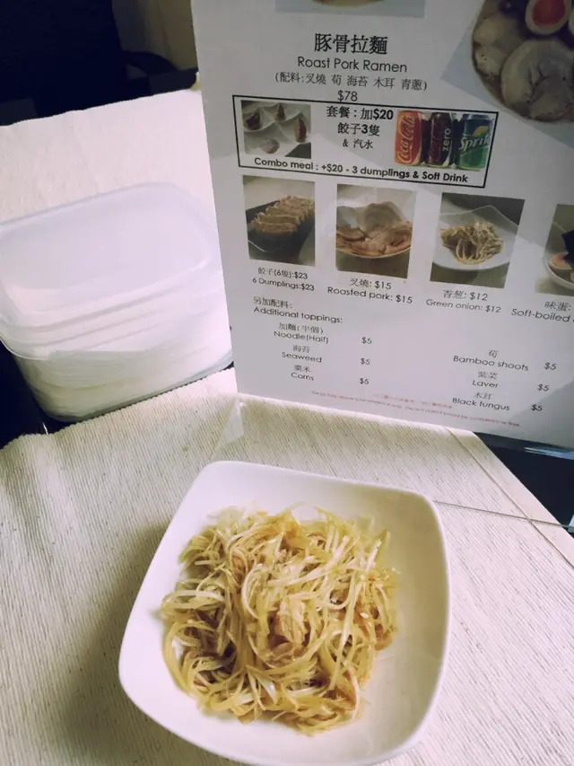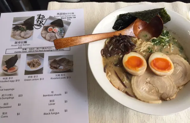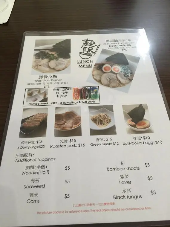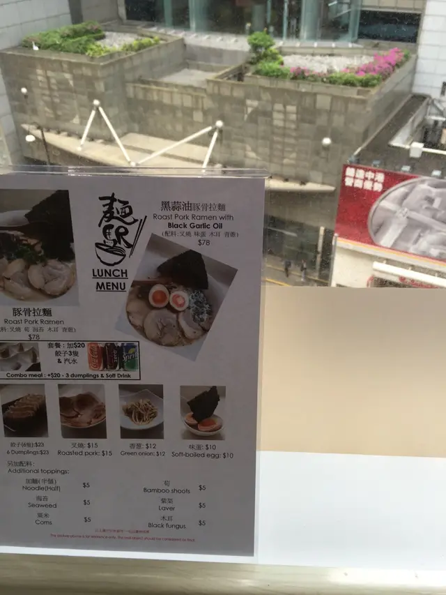 雖在中環上班, 但Lunch time總是人多難搵位但難得今日honey過來近上環見客, 一於同佢起上環食個快lunch就在鐵路站附近的一條小巷 (早前來過同一楝大廈的另一間食肆, 唔識路既其實都幾難搵)lunch 時間人流非常多, 又唔知食乜, 被樓下派傳單的吸引了, 一於上去試試餐廳環境不算大, 座位大約十多個, 整體也夠乾淨整潔侍應遞上Menu, 只得2個拉麵供應Lunch 來說, 最好是簡單, 快靚正! 而對住我呢d有選擇困難症的人, 少選擇也許是好事~同honey每人叫一款, 佢就加多$20轉套餐 (3隻餃子+汽水)等候也不需太久, 雖然短短的lunch, 但侍應是招呼周到的先送上冰茶, 很好, 不是熱, 對著趕頭趕命的中環打工人, 乜都要快, 熱茶跟本就飲唔到另外檯上也一應俱全, 紙巾都供應埋, 唔錯好了, 黑蒜油豚骨拉麵先來, 其實menu已寫上每份拉麵入面有咩材料它家的黑蒜油比平日食開的唔黑, 面頭也沒一層黑油 (有時很怕那層油呢)不過.....它真的有飄香的蒜香味隨後豚骨拉麵也來到, 看得出湯的顏色是清淡一點, 但夠味的豚肉有4大片, 很嫩雖然是趕, 但也看得出廚師也悉心的排出賣相, 唔會亂糟糟的兩款既麵質煮得剛好, 唔會太淋又唔會過硬另外套餐的餃子, honey話好好味, 煎得很香雖然是很簡短的一個lunch, 但小店的服務是做足, 也不斷為客人加添冰茶, 也都很有禮貌!至緊要起短時間內為客人送上味道唔錯的午餐…查看更多