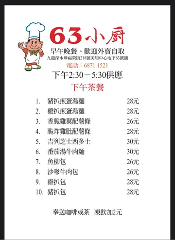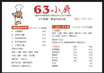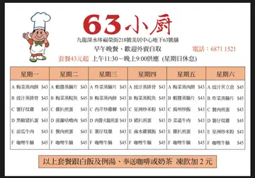 63小廚 (長沙灣) 網址: https://s.openrice.com/QrbS08nmB00 地址: 香港長沙灣福榮街218號美居中心地下63號舖 電話: +852 68711521