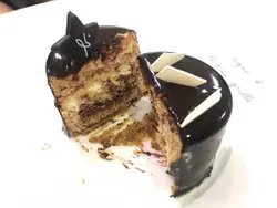 切開裏面層次分明,呢個係三個裏面我最鍾意嘅外層係黑朱古力中間係香軟的伯爵茶蛋糕一路食,心一路溶化