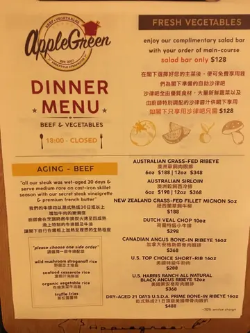 星期五同事們想吃好d, 亦有同事因為減肥要食素、蔬菜水果等菜色,於是我們一行六人去了近佐敦近尖沙嘴警局對面的Apple Green.餐廳新裝了兒童遊樂場,如果一家大小來,小朋友見到這個應該好開心!😄👍🏻可是菜單改了,沒有了我們之前愛吃和每次都有幾個同事必食的炸魚薯條😭我們都很失望⋯⋯正想諗住好否轉埸之間,有同事一埸來到不如試埋呢次看看先⋯⋯價錢比之前貴了些,沒有了那好味的魚餐,反而多了個自助沙律吧。Salad bar 款色很多,有許多不同的蔬菜又有湯全都是任食!😋👍🏻來到主菜,主菜比之前差了許多而且汁不夠比較乾,份量都少了⋯⋯另一同事叫了牛扒整體,主菜麻麻但Salad bar 不錯👍!…查看更多