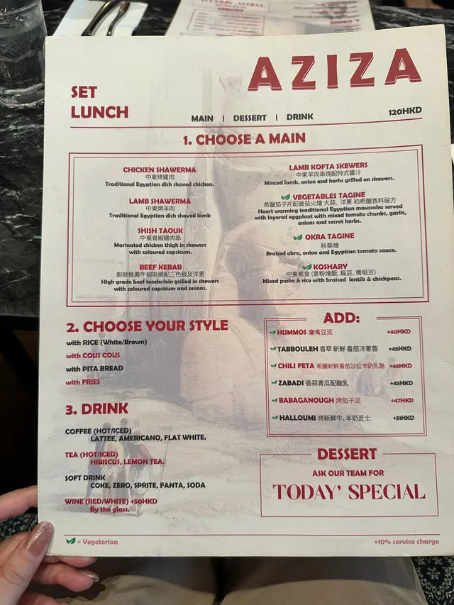 Aziza Egyptian & Mediterranean Cuisine (西環) 網址: https://s.openrice.com/QrbS0sz84W0 地址: 香港西環石塘咀德輔道西345號維港峰地下1B號舖 電話: +852 28864889