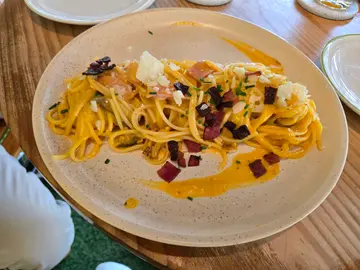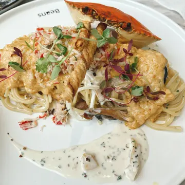 今天和朋友來到這間餐廳聚會,平日的中午有提供午市套餐,我們分別點了黑松露軟殼蟹意大利粉和手撕豬仔骨漢堡,另外做會員送精選蛋糕,選了開心果蛋糕。黑松露軟殼蟹意大利粉:軟殼蟹是即炸的,外皮十分酥脆香口,每一口都充滿著淡淡的蟹肉香氣,意粉質感煙煙靭靭,黑松露醬汁的口感亦不會太膩,是一道出色的意粉。手撕豬仔骨漢堡:豬仔骨手撕之後便做成漢堡,質感很柔軟嫩滑,肉汁四溢,而且醬汁甜甜的,非常惹味可口,薯條亦是即叫即炸,味道相當不錯。特濃開心果杏仁蛋糕:雖然開心果味都算濃郁,但是這款蛋糕卻沒有太多忌廉,口感比較乾,個人便不太喜歡了。凍美式咖啡:午市套餐送飲品,凍飲都不用加錢,我們便點了凍美式咖啡,可以選擇加奶,咖啡味都算香濃,味道還可以吧。價錢方面,軟殼蟹意粉$86,手撕豬仔骨漢堡$94,飲品跟餐免費,蛋糕會員免費贈送,餐廳設有加一服務費,兩人總共$198。總結來說,今次的食物味道相當不錯,而且平日中午的價錢相當划算,下次有機會都會平日中午來吃。…查看更多