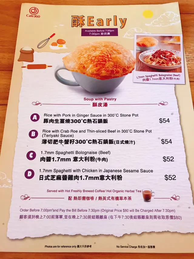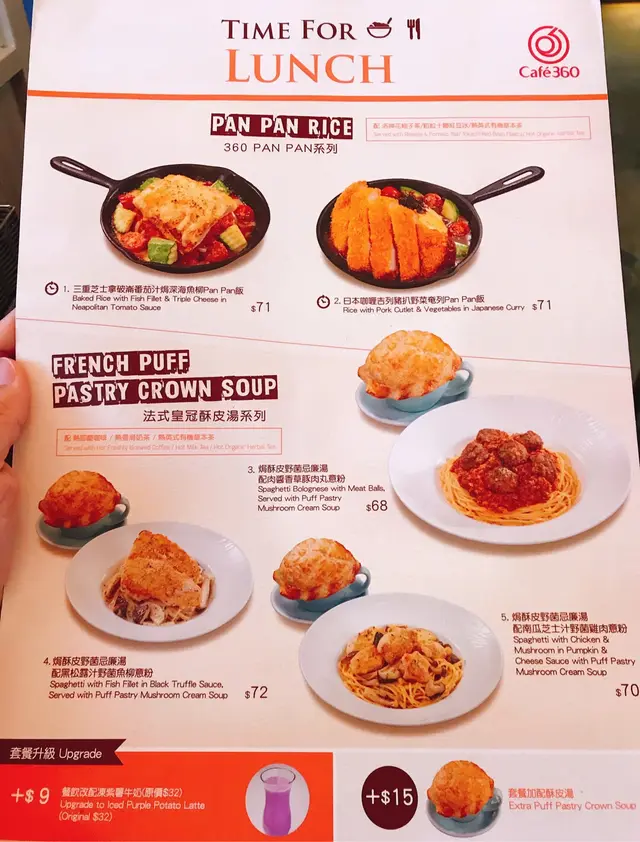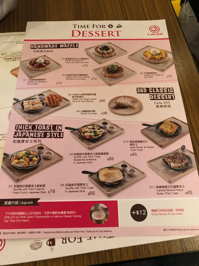 今日約咗朋友但還有2個小時,所以就在朋友推介下去咗深水埗西九龍中心6樓的360cafe 邊吃邊等😬店鋪裝修簡潔,坐位亦很闊落,重點寜靜,坐著吃個Tea 很舒適和這裡不限時,是攝時間之選🙊因為價格實惠🙊🙊本來想吃甜點但又很想喝酥皮湯,所以最後決定吃炸魚薯條,加$15配酥皮湯😍炸魚啖啖肉🤤🤤不是一般的魚柳🙊以$58元這價格👍🏻配埋個松露醬,簡直絕配😚薯條熱辣辣又很脆口👍🏻酥皮湯個酥皮很香奶油味,很邪惡🙈忌廉湯很濃郁料也很豐富👍🏻本來餐是配紅豆冰,但實在太飽🙈改飲凍檸茶😅😅最後一提,可以加$18配以下小吃或甜品啊!不過,我要留待下一次才試lu😚😚…查看更多
