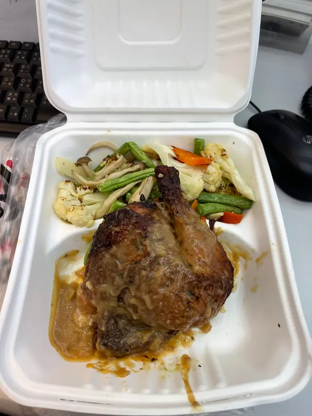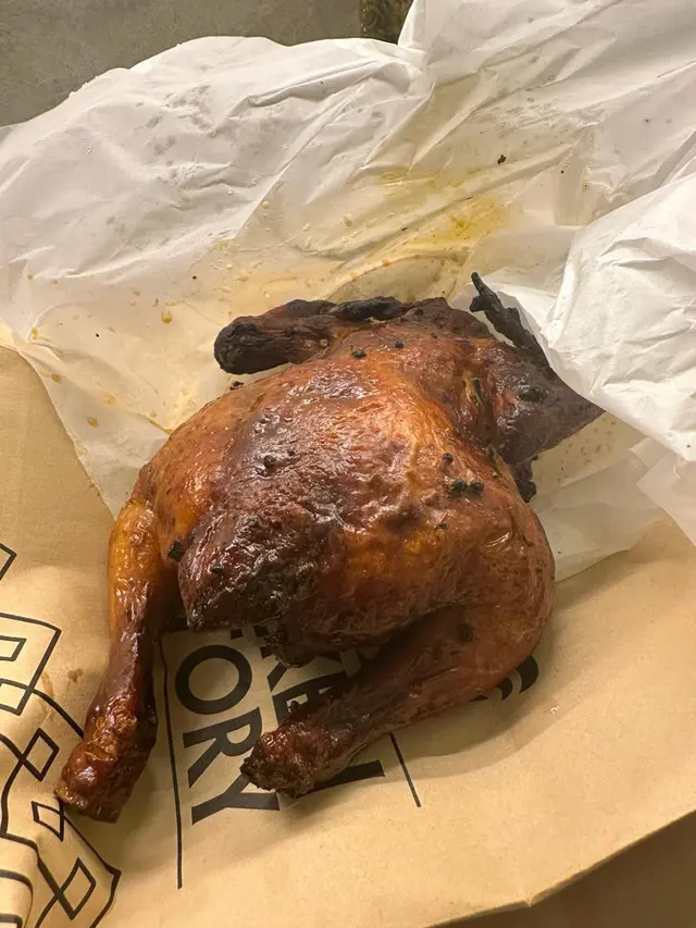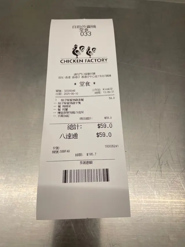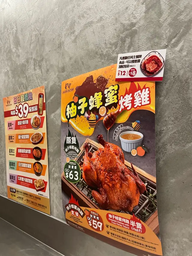我喺香港仔嘅CHICKEN FACTORY食咗一餐。呢間餐廳位於香港仔中心嘅地下,環境乾淨整潔,裝修簡約現代。我叫咗一份柚子蜂蜜烤雞套餐,價錢係$59.0。等咗大約10分鐘,食物就上枱咗。首先,我要讚下佢哋嘅服務態度,員工友善而且有效率。講返食物本身,柚子蜂蜜烤雞真係幾好食。雞肉外皮烤得金黃酥脆,內裡肉質鮮嫩多汁,每一口都充滿咗滿足感。柚子蜂蜜嘅味道清新香甜,同雞肉嘅鹹香味完美融合,令人回味無窮。除咗主菜之外,套餐仲包括一份烤雑菜同一份焗薯。烤雑菜新鮮爽口,焗薯則軟糯香甜,兩者都為整個餐點增添咗豐富嘅口感層次。最後,我仲飲咗一杯樽裝御翠鳥龍冷泡茶。呢款茶飲清涼解渴,帶有淡淡嘅花香同果香,非常適合搭配油膩嘅食物飲用。總括嚟講,CHICKEN FACTORY係一間值得推介嘅餐廳。無論係食物質素定係服務水平,都表現得相當出色。如果你鍾意食烤雞類嘅菜式,咁你一定唔可以錯過呢度嘅美食體驗。…查看更多