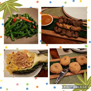這家餐廳氛圍很不錯,高挑的天花板搭配柔和燈光,感覺相當溫馨舒適。馬拉盞炒通菜的醬汁很美味,不過蔬菜本身稍老且有點韌。沙爹雜錦串(豬肉、雞肉、牛肉)相當好吃!每種肉串都多汁夠味,搭配的沙爹醬更是濃郁可口!蟹肉炒飯也很棒!份量十足。飯粒炒得乾爽不油膩,做法簡單但充滿鮮味,帶有淡淡的蟹香。芒果糯米飯整體風味頗佳,雖然芒果本身甜度稍欠,但糯米非常軟糯,在椰奶和芒果的搭配下,呈現出非常平衡的風味,令人愉悅!