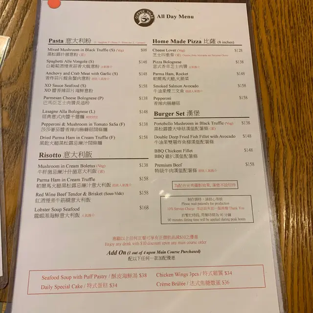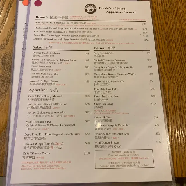這家可算是太子區元老級的咖啡店。這家就是開業數年的Coffee TALKS咖啡講咖啡店。整間餐廳以木為主題裝修,環境寬敞簡約舒適。而且食物種類繁多。我們點選了蟹肉他他沙律班尼迪,特式拼盤,Mocha 及 Caramel Chocolate.🦀蟹肉他他沙律班尼迪 $138賣相擺盤都美,適合打卡。水波蛋切開蛋汁源源不絕的流出,再配上班尼迪不可缺少的荷蘭醬。水波蛋下鋪滿蟹肉及蟹籽,口感很有層次。🍟特式拼盤 $168拼盤相當豐富,有炸脆魚柳,香辣雞翼,薯條,煙三文魚及帕爾馬火腿沙律。最驚喜的是香辣雞翼除了多汁,還帶有陣陣柚子酸味,酸酸辣辣太好味了😋其他就不過不失,沒有太大驚喜,但味道不錯的。☕️Mocha $48🍫Caramel Chocolate $48 (*跟餐減$10)飲品方面,賣相不錯,為了影相效果美一點當然要有Cream喲。但因為太多Cream整杯奶味太濃,不是我們的口味。整體來說環境食物都不錯,下次再來我不再選有Cream的飲品好了😝很久沒有去原來已靜靜的結業了😫…查看更多