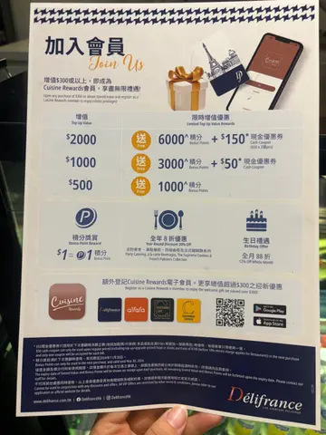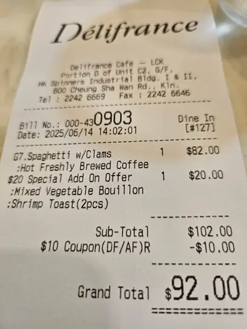 昨晚和男朋友放工來食Delifrance,好耐無食過啦 記得它的下午茶四色baguette 多士好正。今晚我地叫左個二人set,有兩個主菜,餐湯或沙律同兩杯飲品。包特飲所以我地叫了兩杯芒果熱情果疏打,幾好飲,夠甜我喜歡。餐湯男朋友飲的是番茄湯。應該一般啦。我要的沙律有番茄,菜同提子乾落了胡麻醬,ok的。有提子乾有少少口感。主菜方面我就選了菠菜雞肉螺絲粉。螺絲粉比想像中好食,索左忌廉白汁好creamy,雞扒好大塊,仲加左核桃碎,好焦脆!男朋友要的是Carbonara,應該都不過不失!最後跟個甜品蝴蝶酥,好食。…查看更多