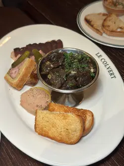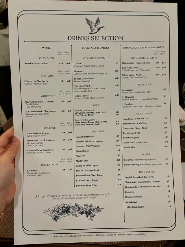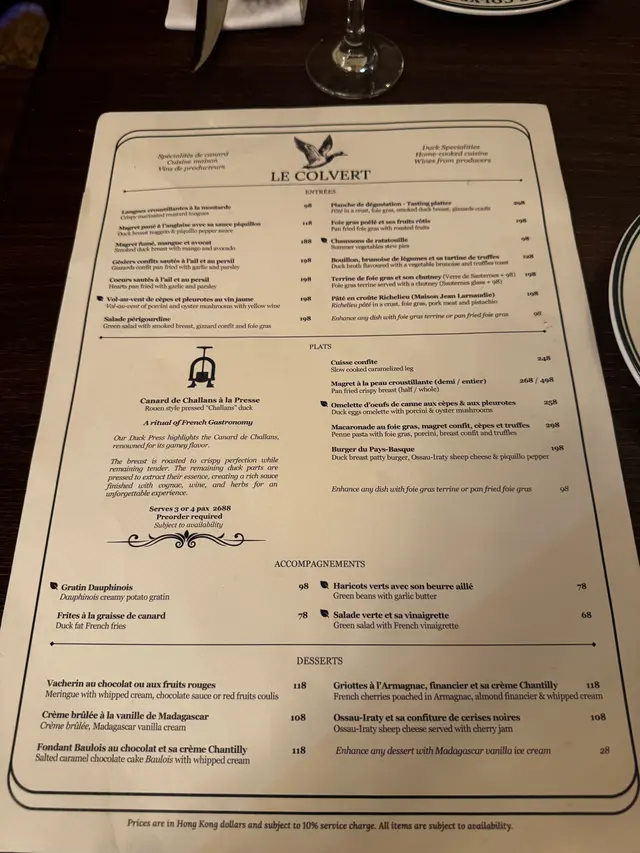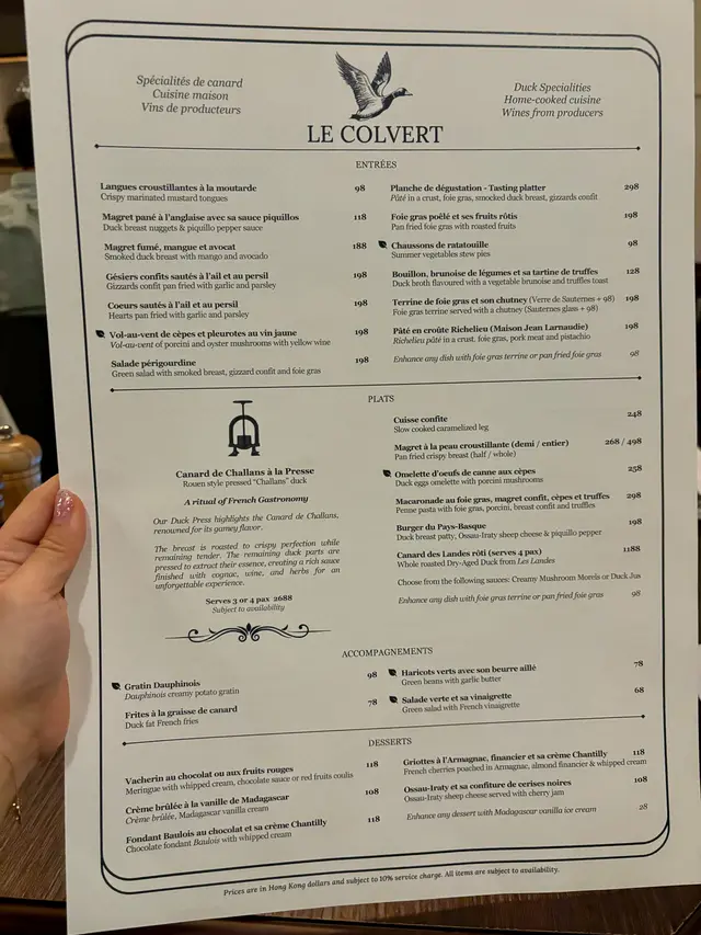 最近食咗唔少生日飯,其中一間我就私心揀咗最近好想試嘅Le Colvert,係一間位於西營盤嘅法式小酒館,以鴨做主題🦆頭盤、主菜、side dishes都圍繞鴨肉,好似煙燻鴨胸、鴨肝、鴨腿、原隻血鴨等等,好有特色👏🏻餐廳內外都放咗唔少鴨嘅裝飾,環境有啲外國小餐館嘅鬆弛氛圍🥳🍞Amuse Broche餐前小食有鴨肉多士,將開胃嘅鴨肉醬料塗上脆口多士,口感幾好😛🍘Duck breast nuggets & piqufillo pepper sauce $118賣相有啲似馬介休球🤣其實係將鴨肉炸成金黃香脆嘅球,咬開脆皮就會食到頗有肉香味嘅滿滿鴨肉絲,點少少蛋黃醬更惹味😋🧆Pate in a crust, foie gras, smoked duck breast, gizzards confit $298For sharing嘅頭盤,一次過試到鴨肝醬、油封鴨胗、煙燻鴨胸及鴨肉凍批😍鴨肝醬甘香味濃😋鴨胗好彈牙;鴨胸煙燻味濃好特別;鴨肉凍批口感味道豐富,四款各有特色,必試✅🍏Pan fried foie gras with roasted fruits $198另一款頭盤食得邪惡啲😈有肥美厚身嘅煎鴨肝,鴨油出晒嚟好正🤤配煎青蘋果食平衡膩感剛剛好👍🏻🍗Slow cooked caramelized leg $248主菜之一叫咗鴨腿,大大隻鴨腿炸得金金黃黃好吸引,外皮好脆🤩鴨肉肉質剛好唔會柴,只係外皮稍為鹹咗啲。🥩Pan fried crispy breast (half) $268鴨胸份量十足,食到鴨肉香味,口感好彈,具咬口😛不過就食唔到脆嘅感覺。🍟Duck fat French fries $78配菜當然要揀邪惡嘅鴨油薯條,雖然薯條並非好脆口,但薯味及油香味突出😻令人忍唔住係咁食🤪🍫Salted caramel chocolate cake Baulois with whipped cream $118慶生點可少得甜品😎朱古力蛋糕焗得好濕潤,可可味濃,食落帶點鹹香味,味道唔錯👌🏻🍷Non-alcoholic red wine $108/cupSalted raspberry, chamomile 嚟到法式小酒館,呢度有唔少酒類選擇,唔飲酒嘅我就試吓無酒精紅酒🍷店員會端埋酒樽去斟,飲落有氣泡,酸酸爽爽有啲似氣泡酒😗推介指數(10分為滿分):8分…查看更多