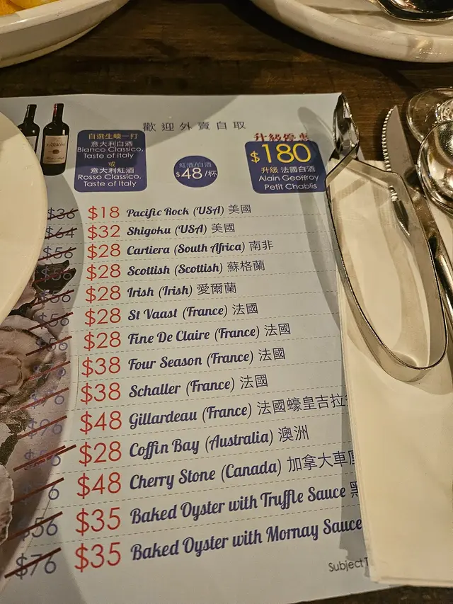 6:00pm 後,生𧐢正價收費,冇要緊,紅白酒任擇。生𧐢種類繁多,最好是weekend 到來會選擇更多,當晚筆者星期四晚到來,想選Cherry Store,他們話星期五先有貨,所以想食咩,請預早通知食店。