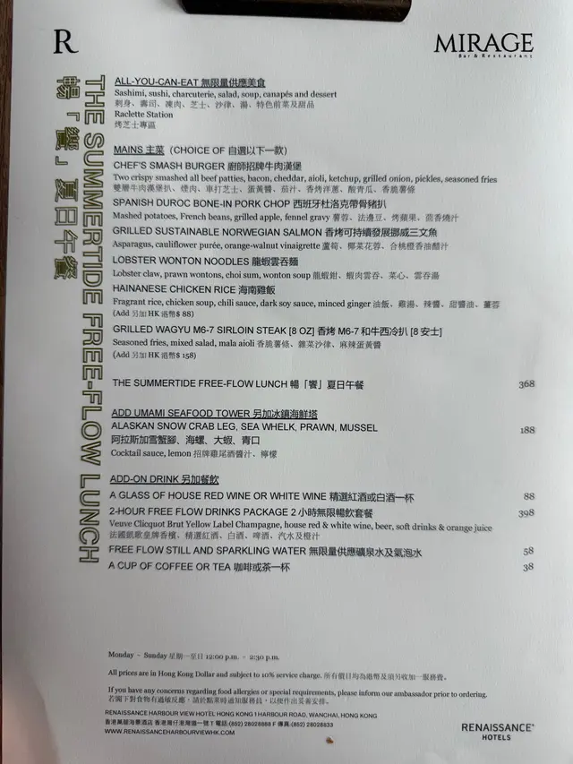 每次來到會展大多數是來看展覽多,想吃點東西大多會到灣仔附近覓食;但其實會展旁邊的酒店就有好食推介!最近這間酒店就推出了一個非常超值的自助午餐,性價比極高,連男友也說希望再訪再吃!暢「饗」夏日午餐 $220/ pp(不含主菜) $313起/pp(含主菜)冰鎮海鮮拼盤(另加 $188)焦點主菜:西班牙杜洛克帶骨豬扒及香烤和牛西冷扒(另加 $158) 這裡的午市自助餐分為包含主菜和不含主菜兩款,假如選擇前者的話只需二百多就可以了!食物種類也有很多選擇,場內設有刺身、壽司、烤芝士專區、凍肉、芝士、沙律、湯、特色前菜及甜品無限量供應~ 最吸引的想必是烤芝士專區,場內有工作人員不停烤熱芝士,再將芝士熔絲放到自選的麵包或餅乾上,整調畫面已經夠打卡,而芝士的味道也很濃郁實在出色!而其他食品也是款式夠多元化,刺身壽司新鮮味美,特色前菜有融入fusion料理的烹調菜色,甜品就更不用多說有tiramisu凍餅等;假如每款都吃一口的話都已經可以填飽肚子!想再豐富一點,可以額外加配冰鎮海鮮凍盤,集合了多款人氣海鮮如阿拉斯加雪蟹腳、海螺、大蝦和青口~ 雖說是凍盤,仍可嚐到其自身的鮮甜味道!如果以上都未能完全滿足你的話,就可以多配一個自選焦點主菜~ 這次就點選了西班牙杜洛克帶骨豬扒及香烤和牛西冷扒,兩款都是以炭烤的方式處理,首先肉的品質已經很好,用最簡單的方法烹調已經很好吃,加上兩款肉都屬於肉味濃郁、油花豐富和肉質鮮嫩多汁的一類,分別就在於帶骨豬扒會自帶天然的甘香味,骨頭的存在使得肉質更加好吃及增加了風味層次;後者的口感扎實帶嚼勁,整體口感因著適中的油脂而變得更加平衡,各具特色啊店家是位於香港會議展覽中心旁邊的五星級酒店內,環境一流有非常大的落地玻璃,可邊飽覽維港景色邊享受美食啊~ 服務也是非常周到,主廚和餐廳經理都不時走來了解客人對食物的意見;舒適度更加是100%!要留意這個半自助午餐只供應到本月31日啊…查看更多
