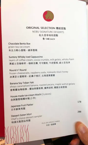新派帶子刺身 新鮮美味的食材 必須配上美酒,讓氣氛更加愉悅雜錦壽司帝皇蟹天婦羅鱈魚西京燒美國牛肉燒蜆肉茶麵大豆奶酪因為朋友生日,另外㸃了一個綠茶柚子蛋糕NOBU的夜景很美,能用這樣的價錢享受到五星級酒店的晚餐,真的不是經常遇到。