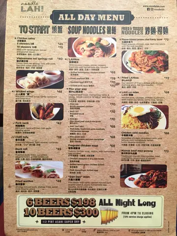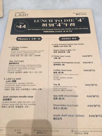 下班跟朋友上完爆汗的課,大家不約而同晚餐都想吃湯麵,在OPENRICE 找到這間Noodle LAH! *我喜歡它開放式的裝潢,樓底高,雖然身處繁忙的上環,但不會有很焗促的感覺。*餐牌就是這一張,麵類款式特別多,每款都很吸引,而且重點是價錢不貴。*這是飲料的餐牌*第一次來的我們都點了喇沙,看到旁邊的人在吃都已經有點流口水了。朋友點了香茅雞胸喇沙,香茅的味道很入味,略覺得雞質「鞋」了一點點,但一口一塊很方便。*我就點了輕炒牛肉喇沙,我喜歡這些「碎濕濕」的大小,跟麵一起一口吃下去都很OK 。牛肉很重口味,份量不多不少,算是不錯吃。*差了忘了說最重要的湯底,湯底味道濃郁,只有一點點辣,我覺得不吃辣的也可以吃。我最喜歡的一點是他的咸度拿掐得很好,而且不會很「椰」,我最怕的就是加很得椰奶的喇沙。它的麵是蛋麵,不知是不是自製的但很好吃,而且很掛湯。*總括而言我覺得Noodle LAH!不錯吃,環境舒適而且價錢不貴,如果下次來的話我會想試試它的炒喇沙!