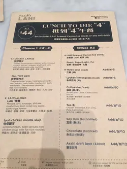 放工行過經過見到個牌寫住「抵食到4午餐」,$44個lunch,仲要有野飲,係中上環區,真係好抵食喎!搵日lunch同同事去食先!午餐選擇得4款,但都有招牌喇沙揀,好似隊長甘唔食辣既,其餘3款都係唔辣的,飲品就只得紅茶/汽水,咖啡/奶茶就要加錢,但好特別地加$10有朝日啤酒飲,飲得的話,其實都幾抵。咳緊又唔食得辣既隊長只好揀豬肉河,同事分別揀左喇沙同撈麵,豬肉河比我想像中多料,有扎肉、貢丸、腩肉,好彩腩肉唔算好肥,不過河粉既份量就少左d,但味道都ok,湯底唔算係味精湯,$44有呢個水準都唔錯。同事碗喇沙,佢話個湯底稀左d,不過辣度就岩岩好,太辣佢會食唔到。反而好似最流既撈麵係最好味,個個係甘夾同事碟麵食,可能d肉碎用黑豉油做醬汁,撈埋落個麵到好好味,加埋d麵唔會太林,有d彈牙