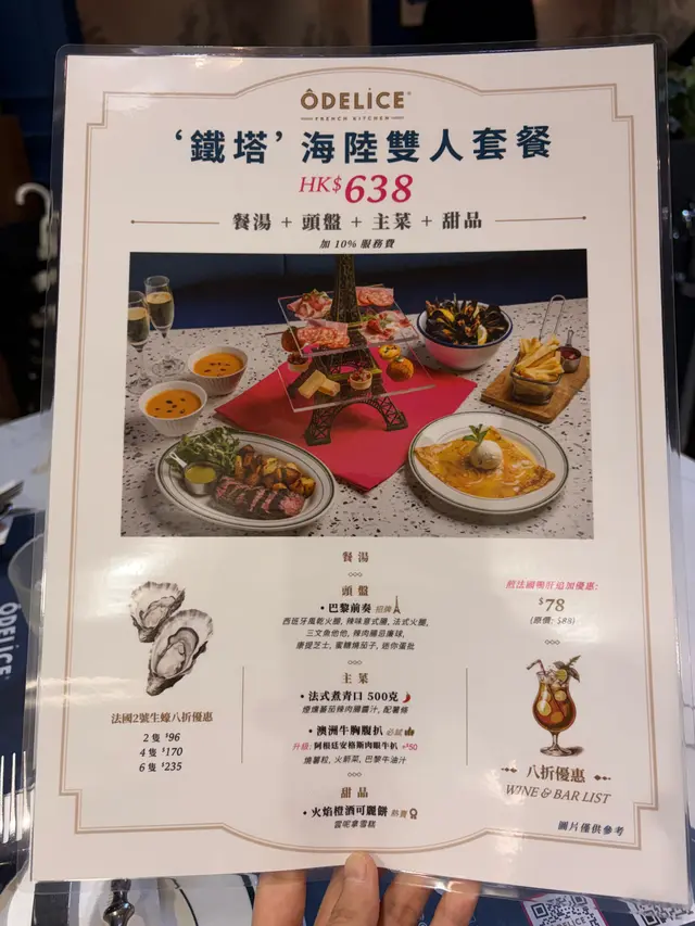 沙田「ÔDELICE」餐廳環境法式氛圍感滿滿,仲要唔同晚市套餐組合For不同人數,所以啱曬約會同朋友、屋企人過嚟聚餐。*此餐廳收取全單10%服務費。 晚市套餐二人餐(單點$538),法式烤黃雞半隻,表面鋪滿香料,雞皮色澤金黃,口感香脆,雞肉肉質嫩滑,食落好Juicy、帶有雞油油脂香味,配以松露野菌醬汁食用,味道濃郁,薯蓉口感幼滑。紅酒燉牛面頰意粉(跟餐$0),表面鋪有香蔥,牛面頰燉得好軟嫩、帶有膠原蛋白,食落好入味,意粉容易掛汁,配料包括有煙肉、紅蘿蔔、獨子蒜。香煎帶子2件(跟餐$0),帶子經過香煎之後,外層帶有焦糖化,肉質一絲絲,味道鮮甜,配以青豆薄荷蓉、黑醋、炸乾蔥食用,味道清新。法國田螺6件(跟餐$0),田螺肉質彈牙、不韌,食落有鮮味,配以香草蒜味牛油食用,食落好香口,芝士薯蓉味道鹹香。2碗餐湯(跟餐$0),番茄甘筍忌廉湯,表面鋪有麵包多士粒、番荽,口感Creamy,加入鮮磨番茄、甘筍,飲落帶有顆粒感,味道酸甜。2客餐包(跟餐$0),軟歐包多士,口感外香脆內軟硬適中,配以海鹽牛油食用,味道更佳。Strawberry Cucumber Cooler (單點$65),採用士多啤梨果茸、青瓜、檸檬汁、梳打水,飲落好清爽。Iced Matcha Apple Zest (單點$65),採用抹茶、青蘋果果蓉、檸檬汁、蜜糖製作,茶香、果香Balance,再加入蜜糖中和青蘋果果蓉、檸檬汁的酸度,飲落意想不到的搭配。…查看更多
