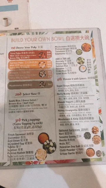 👨🏻🍳Build my own bowl🐟三文魚 (刺身) $88三文魚夠肥美新鮮,有腩位(˶‾᷄ ⁻̫ ‾᷅˵)🍚壽司飯+沙律菜🥗壽司飯開胃,沙律新鮮٩(ˊᗜˋ*)و🦀蟹籽+雜錦香菇+豆腐份量好多,食極都有🍯蜜糖香醋汁甜得黎帶點酸幾開胃🤌🏻脆蒜片+木魚片+紫菜絲脆蒜片咬開好正ʕ •ᴥ•ʔ🐟三文魚 (刺身) $88🍚珍珠糙飯+沙律菜🥗🍄枝豆仁+雜錦香菇+雞蛋絲🐟鰹魚昆布醬油🥑牛油果(+$12)+三文魚籽(+$10)同行朋友第一次食夏威夷bowl都話好好食^ ^佢食到勁飽而我就啱啱好我係大胃王(〃▽〃)唯一美中不足係張枱太高,但張櫈好矮,張櫈仲要唔太穩陣,食得有啲辛苦
