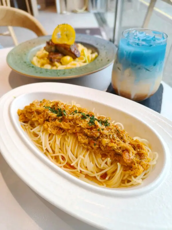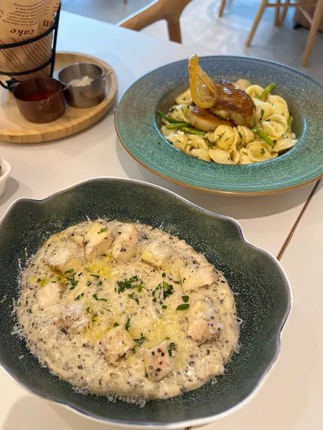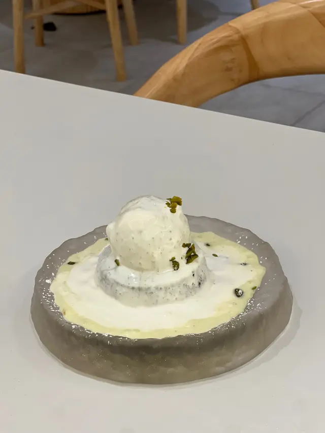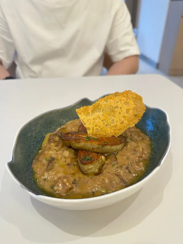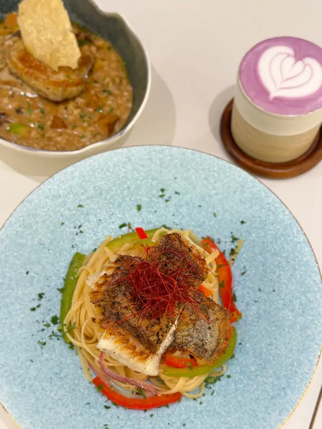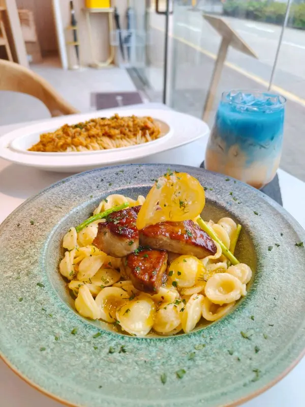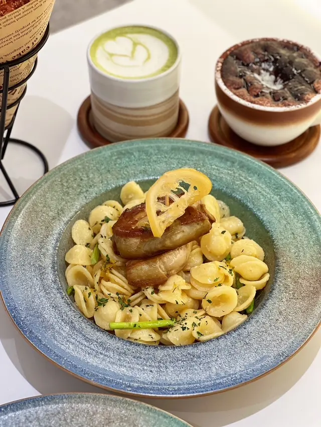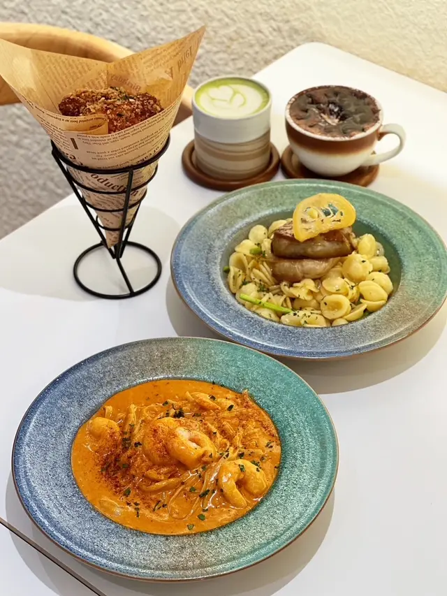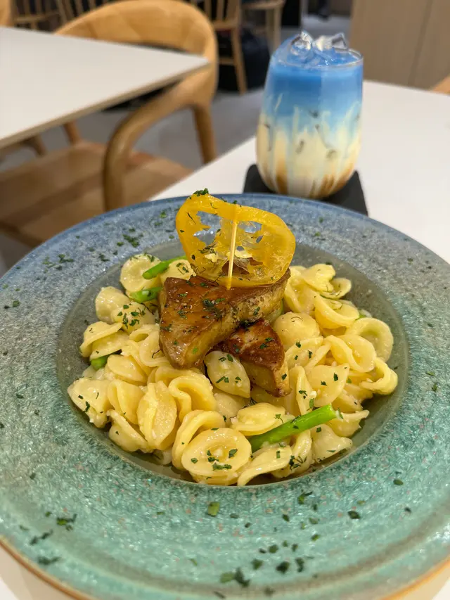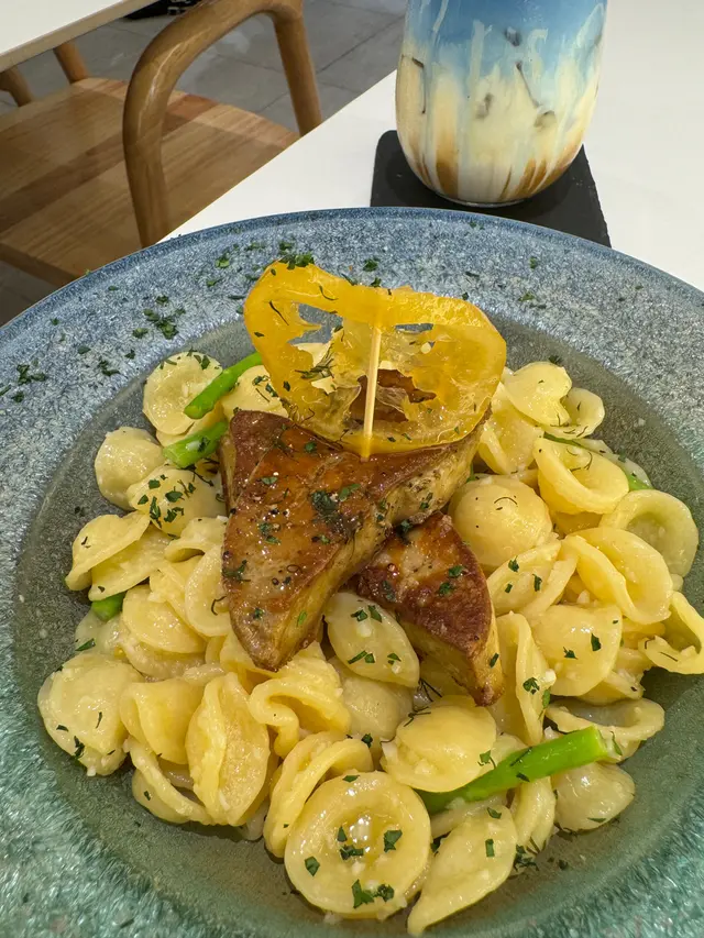 這間人氣咖啡店其中一間分店位於鰂魚涌的龍景大廈,主打精緻輕食、小食、咖啡及甜點。店內環境寬敞舒適,裝潢以日系木為主,氛圍簡約清新,適合約會或多人適會。二人套餐 - $460鵝肝鮮檸檬醬貓耳朵粉 +$20兩塊厚度十足的香煎鵝肝細膩柔滑,豐腴鮮美得入口即化,有鵝油香的濃郁氣息,貓耳朵粉煙韌有嚼勁,有少少蘆筍仔,酸甜的檸檬汁正好平衡膩感。辣芝士醬明蝦扁意粉多隻去殼鮮蝦爽滑彈牙,扁意粉煙韌富彈性好掛汁,濃稠的辣芝士醬順滑惹味。蒜香雞翼六隻肥美飽滿的炸雞中翼毫不油膩,滿佈香脆的蒜蓉粒,咬開嫩滑多汁不乾柴。開心果味雪糕 +$20/球幼滑細膩的雪糕球有濃厚的開心果味,更有開心果碎碎,堅果味十足。朱古力鮮奶 +$10香濃滑順的朱古力有醇厚的可可豆香氣,鮮奶增添順滑感,又有綿密的泡沫,再淋上朱古力醬及白朱古力碎。抹茶鮮奶 +$10轉燕麥奶 +$5優雅醇厚的宇治抹茶有幽香的茶味,滑順的燕麥奶細緻香醇。…查看更多