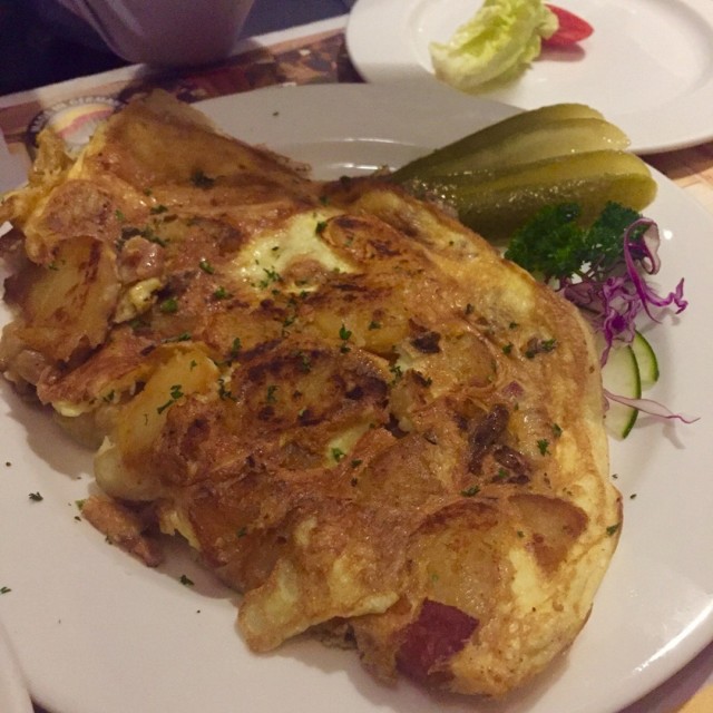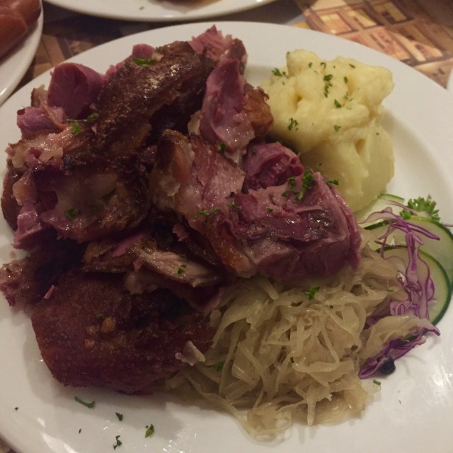 Luckily we had a reservation, pretty crowded, but totally good atmosphere. The pilsner draught beer takes up to 7 minutes, so we went for the draught beer Veltins, which was served very fast. Traditional fried veal sausage with fried potatoes and salad, original mixed sausage platter and pork knuckle with sauerkraut and mashed potatoes were all served as big portions and delicious. All the staff very friendly and professional. The manager even entertained us with some good jokes and a round of free apple schnapps shooters. A great evening in a place I/we highly recommend. Remember to make reservation, it's mostly full house there.…查看更多