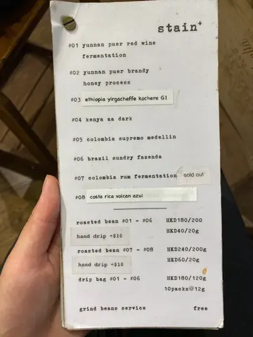 周末的太平山街,悠闲的社区氛围感真好啊!·这条街走两三步就是一家咖啡,我感兴趣的店这几年已经陆续喝过不少了,这次来的是位于见山书店旁、只有咖啡不卖食物的Stain+.·这里更像是咖啡工作室的模式,店内有一台小型烘豆机,豆单不定期更换,一次性提供8款左右的豆子。蜜处理的云南在香港并不多见,还能见到不走寻常路线的深烘肯尼亚。主打手冲,也做意式,还有咖啡豆和冲煮器具零售。·【手冲】选择了一支哥伦比亚粉波旁,喝起来是有点厌氧日晒在里面的,甜感饱满,风味表现力不错,热带水果和红茶占据主导,Long finish让人印象深刻。·店主态度友好有耐心,不忙的时候就各种逗猫咪。环境也挺宽敞的,坐室外舒舒服服,楼上还很适合自习。外墙上巨大的猫咪彩绘非常吸睛(我就是被墙绘种草的),店主说是跟本地艺术家合作的,也是不定期会更新。·不管来多少次都很喜欢这条街,也总是能发现它新鲜而迷人的气质。比如Stain+、见山书店还有隔壁快餐店的室外座位已经融洽到不分你我,书店在周末经常摆出两张长桌举办workshop,没想到快餐店在foreigners中人气都这么高,有被一大盘金灿灿的炒饭香到!…查看更多