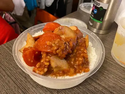 另一款素食飯,是意式蕃茄素肉飯。這一個,《唐記》就說明了不含蔥蒜亦因為這樣,已經成為了我太太的蒸飯首選。因為蕃茄醬,酸酸甜甜,而且有素肉,有蕃茄,有薯仔,有菇同蘿蔔,材料比起梅菜素肉絲更豐富。有汁,有餸,更好送飯,非常之好。