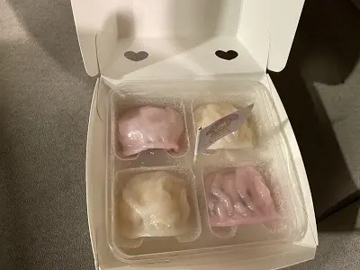 My Melody 雙色餃點心盒,白色的,是傳統的蝦餃;粉紅色的,是以蝦餃形式製作的菜肉餃。蝦餃的味道正宗,可以用香口來形容整個感受。茶肉餃同樣是很香,但在沒有蝦味的襯托下,香口的感覺稍遜。
