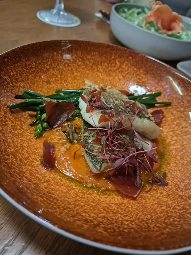 ・煎鱸魚|火腿脆片鋪面+韭菜花墊底,醬汁有淡淡咖喱味