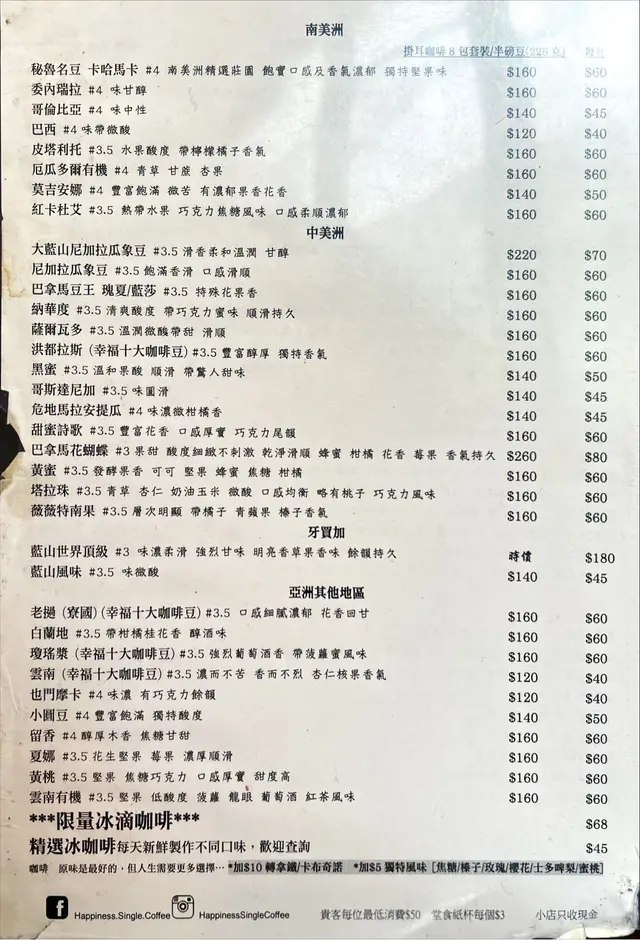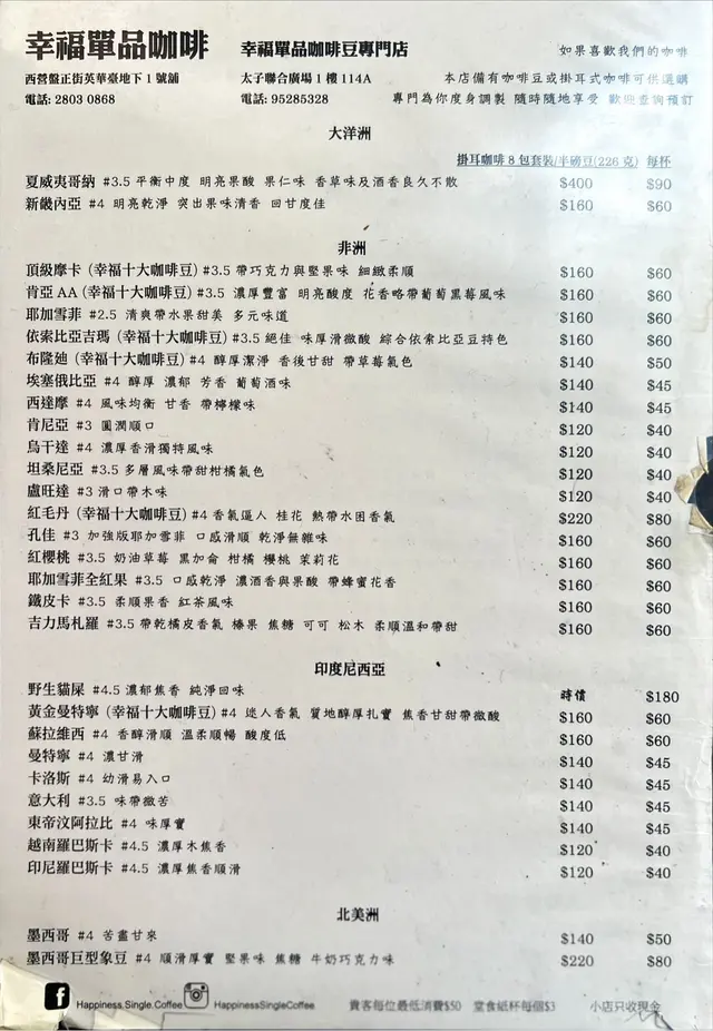 ☕️「幸福單品咖啡」雖說是一家咖啡小店,但咖啡源自世界各地,種類琳瑯滿目,令人選擇困難🙂。到訪當天,我比開舖時間早了一點,於是在附近繞了一圈,途經西營盤社區綜合大樓,大樓外面仍保留着英式建築設計,打完卡,回去已成為當天的第二位客人,一坐下,男店主阿田先奉上一杯暖水。剛開舖,阿田還未開始忙著,花了少許時間給我講解一下選咖啡的心得,他說位於赤道國家的土壤最適合栽種咖啡,因此產自這些國家的咖啡質素比較高,另外餐牌上咖啡名字旁邊的數字代表咖啡的濃郁度,聽著聽著,心中選定了產自非洲的「肯亞AA」。