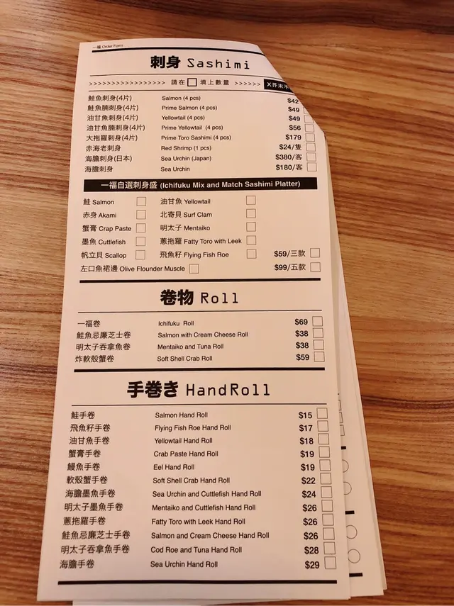單看餐牌和價錢,其實有不少選擇。我倆想了差不多十分鐘,最後決定點一碗刺身丼、一碗拉麵、五件壽司和兩份手卷。