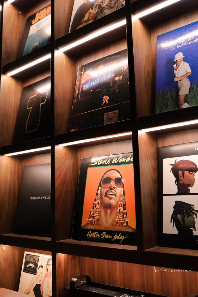 牆壁以黑膠唱片、美酒等作裝飾